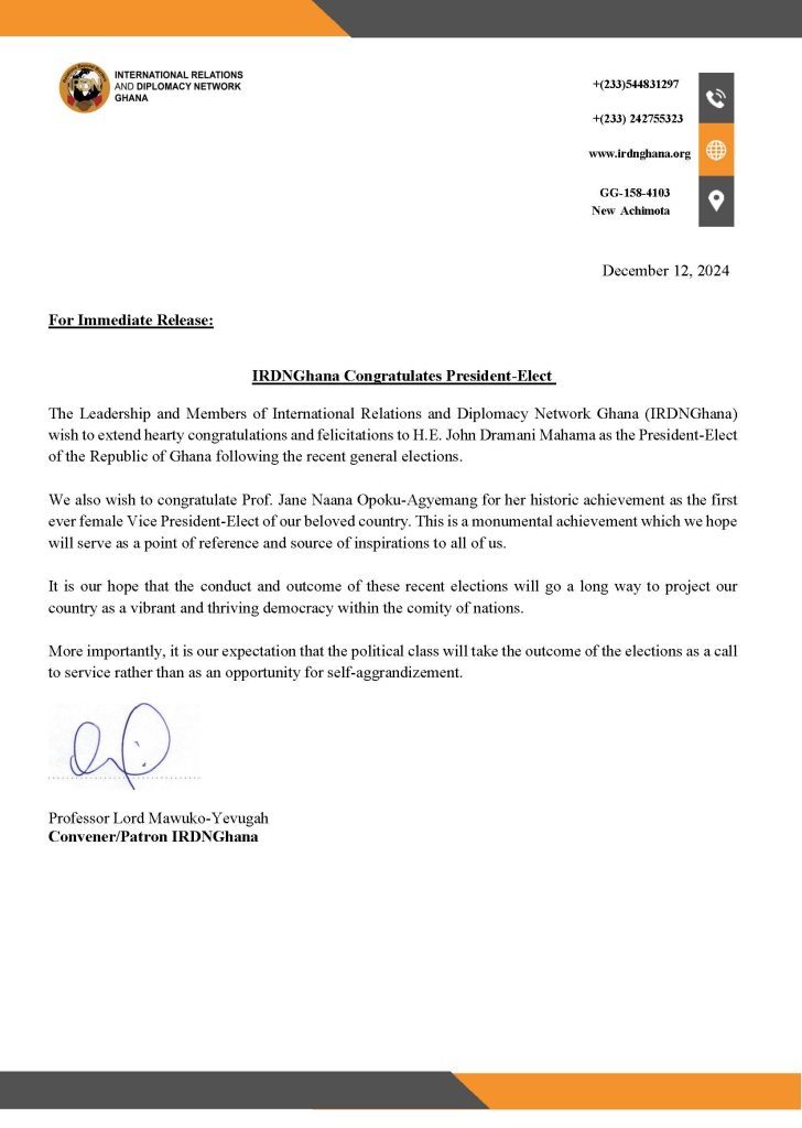 The leadership and members of the International Relations and Diplomacy Network Ghana (IRDNGhana) have extended congratulations to the president-elect of the Republic of Ghana, H.E. John Dramani Mahama.